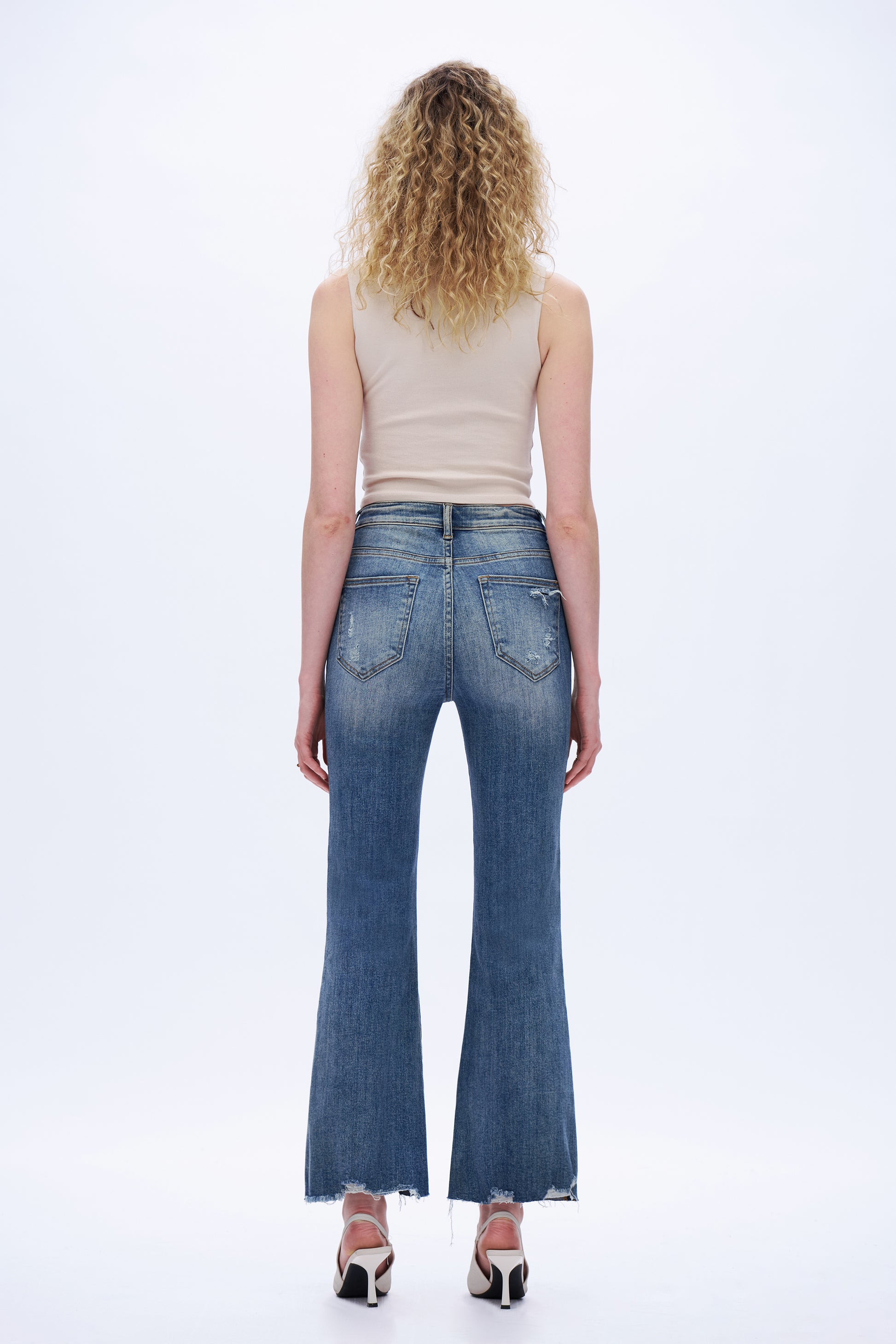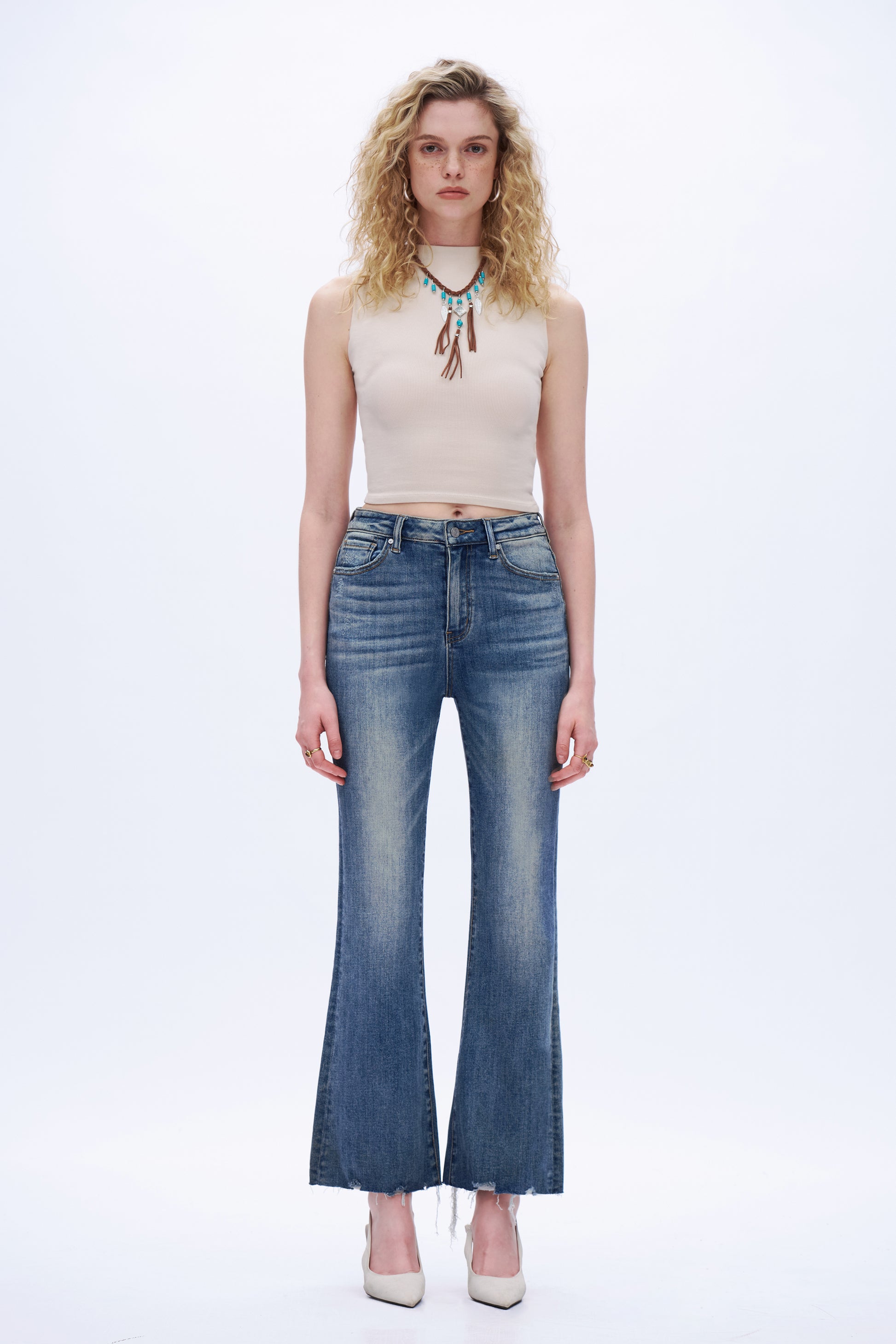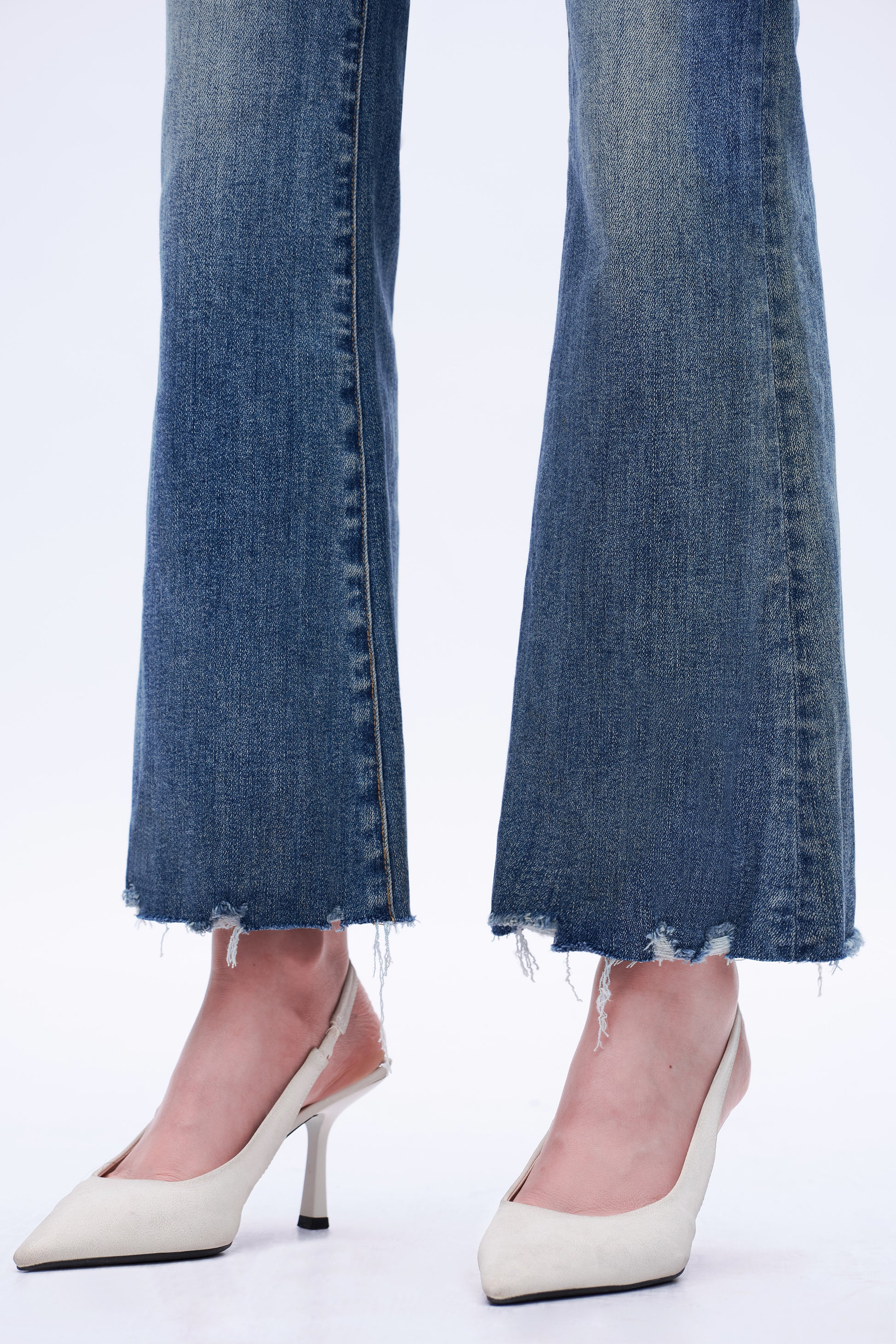 Mid Rise Monkey Wash Flare Leg Denim Jeans DEFM1001 Medium Blue
