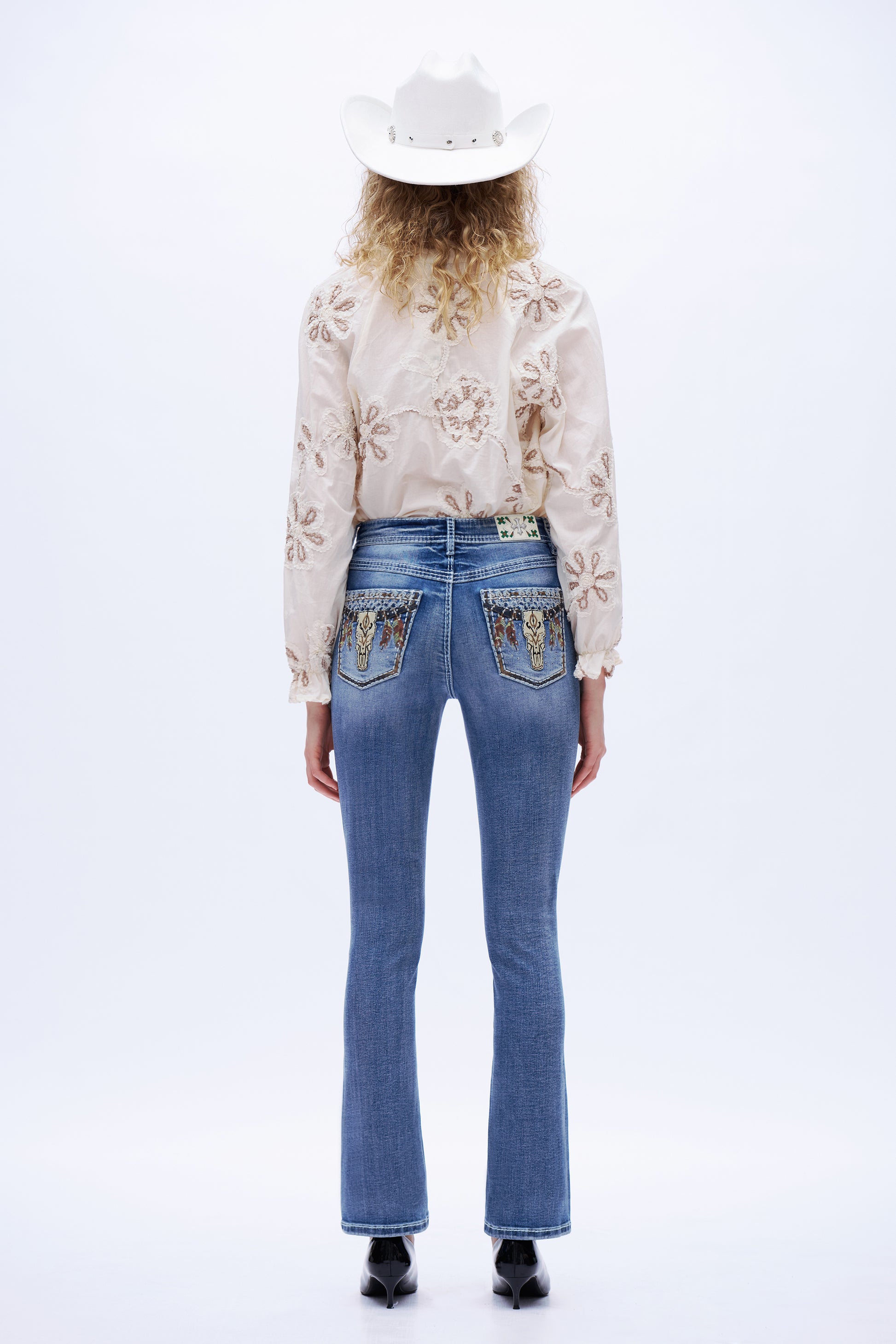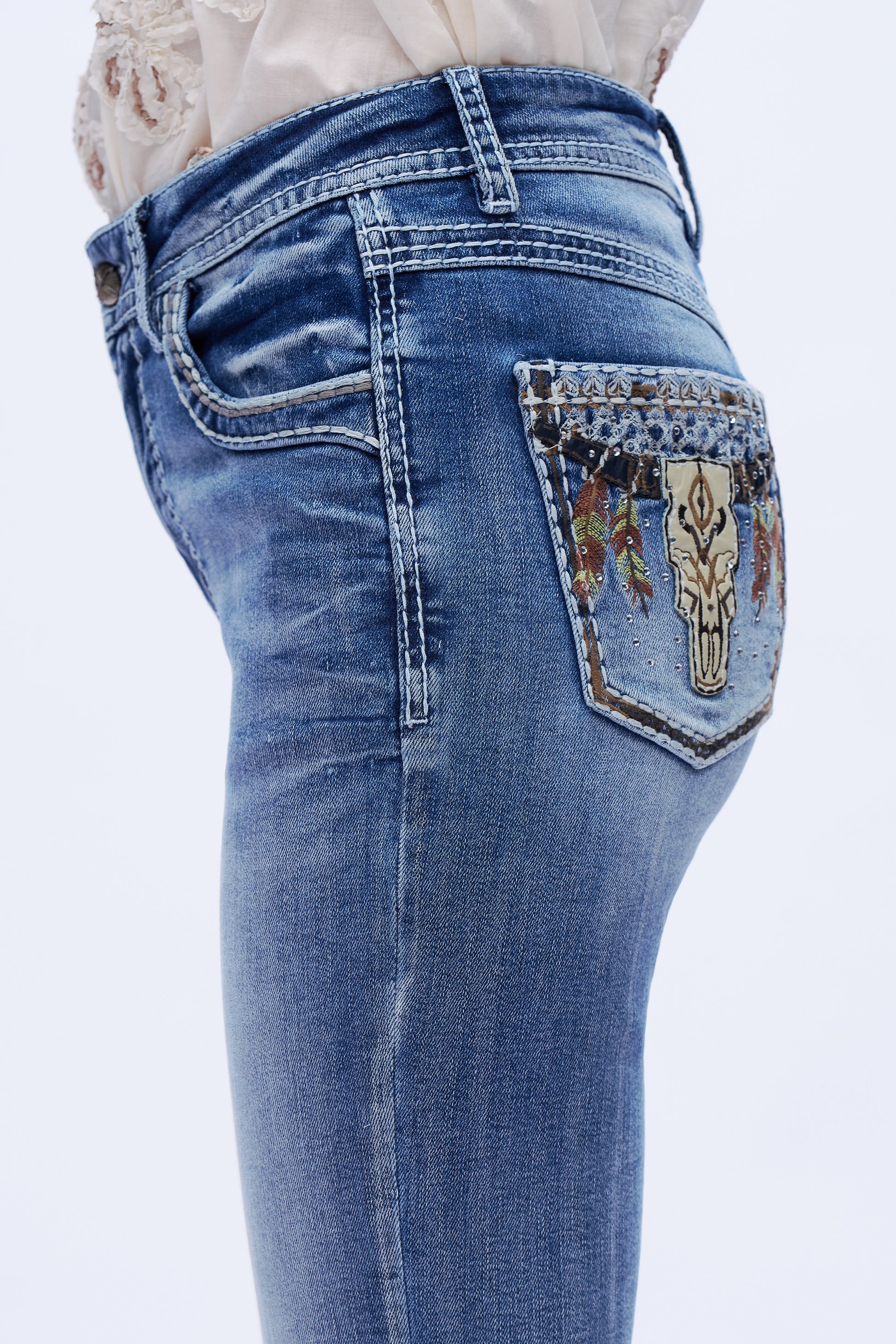 Steet Heads Embroidery High Rise Bootcut Leg Jeans Embroidery DEF1004 Medium Blue